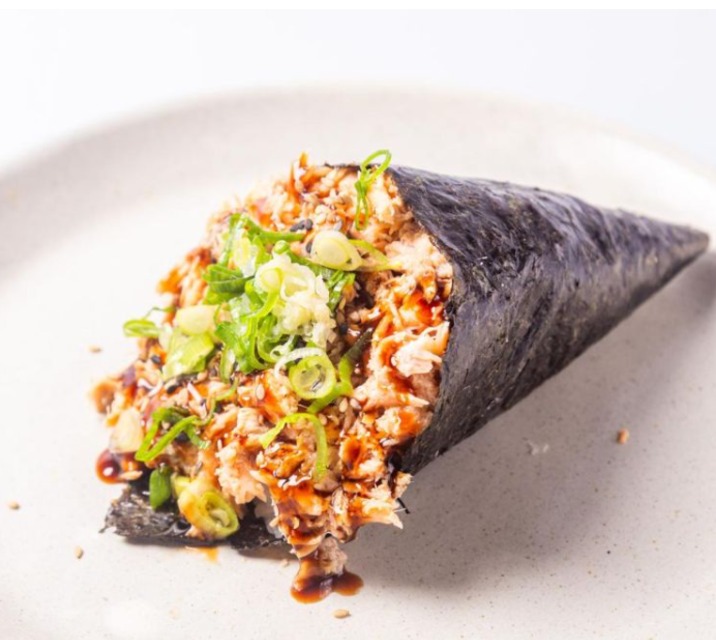 arroz japones, nori, salmão grelhado, cream cheese e cebolinha.